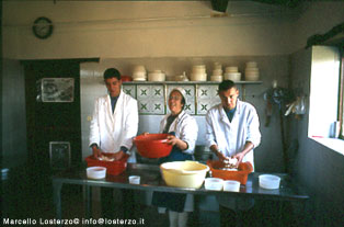![]() gli studenti dell'IPSA "San Benedetto" di Latina mentre lavorano il latte per produrre il formaggio sotto la guida di Gemma |