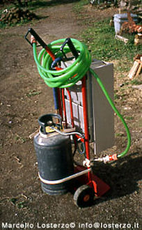 Un esempio di attrezzatura per dinamizzare i preparati biodinamici in una grande azienda. Il tutto è montato sopra un carro agricolo. A destra si vede la macchina per dinamizzare da 240 litri e a sinistra il boiler per scaldare l'acuqa. In tal modo l'attrezzatura può essere spostata in tutte le parti dell'azienda secondo le esigenze. |