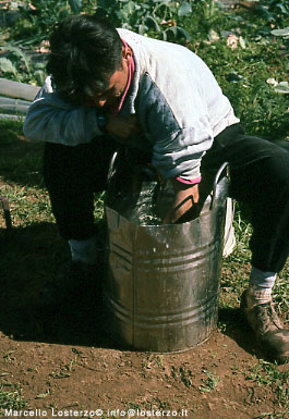 qui possiamo vedere come si effettua correttamente la dinamizzazione a mano (senza usare il bastone). A mano si possono dinamizzare al massimo 50-60 litri di acqua e pertanto, tenendo conto che i preparati biodinamici dovranno essere distribuiti più volte nel corso dell'anno si può comprendere, che a manoä la dinamizzazione la fanno coloro che hanno piccoli orti familiari. Ma già per un'azienda di 3 ettari è improponibile questo sistema.